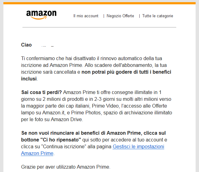 Se decidi di annullare l'iscrizione come ho fatto io tieni conto che i vantaggi Amazon Prime rimangono validi fino alla scadenza per la quale hai già pagato in precedenza.